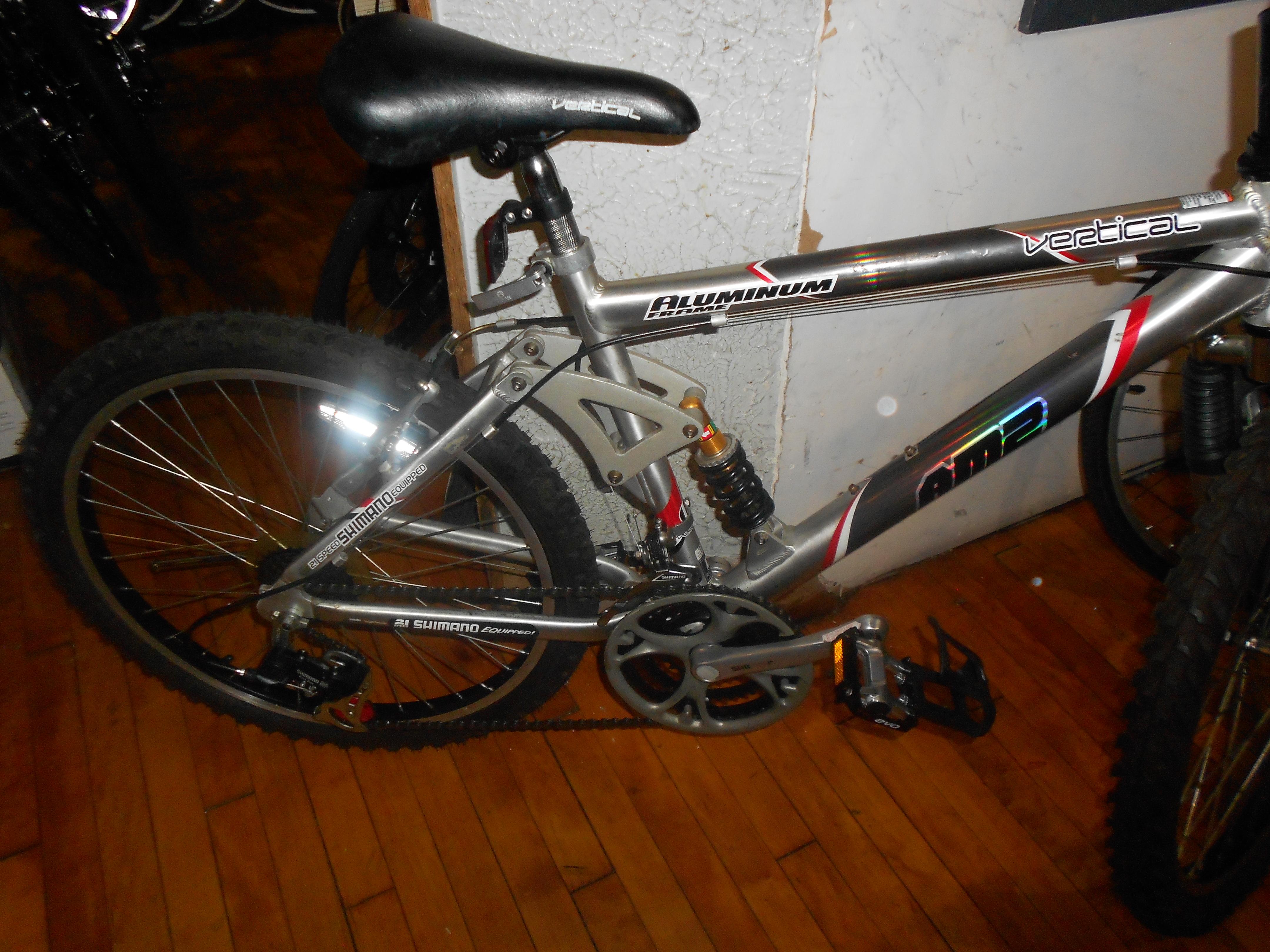 AM2 Vertical Aluminum $300 24″ Wheel Full Suspension as Upgraded with Alloy Body Steel Cage Pedals with Strapless Nylon Mini-Clips-Our Customers Favorite Upgrade! $300 No Details was overlooked as we Lovingly Serviced, Lubricated this Low Mileage Fully Serviced and Upgraded cool Full Suspension perfect for Juveniles and Shorter Adult Full Suspension Bicycle that is Fun to Ride! $300