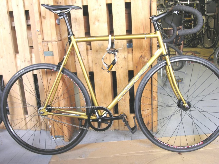 2010 KHS Flite 100 with 700c Wheels, 57cm Reynolds Double Butted Chromo Frame, Flip-Flop Hub (Fixed/Free), Added Upgrades are Stop Flat Tire Liners, Velox French Cotton Rim Tapes, Shimanno 16T Freegear with 2nd Pair of Alloy Body Steel Cage Wellgo Pedals (2nd Pair Extra for Free Gear Riding Occassions) and Strapless Toe Clips effective MSRP with Upgrades and Taxes $870 STEAL IT FOR $700 with upgrades and taxes as included DONE! This is one of the best and most storied affordable quality track bikes ever manufactured.