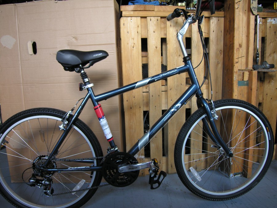 26″ Wheels, 21″ Frame, 21 Speed. This is a nice all around comfort bicycle with wide, plush street slick tires, seat post shock and comfort saddle.