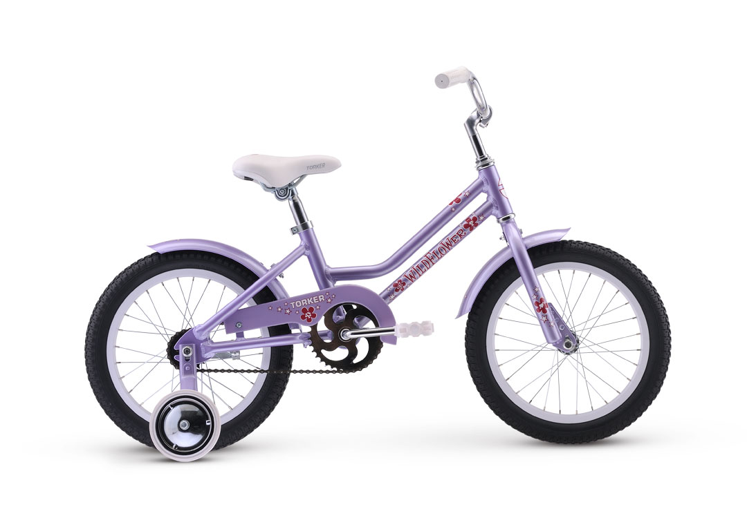 Torkers alloy cruiser style bike w/ flower theme frame saddle matching fenders and white side wall tires. The coaster brake offers great stopping and control while learning to ride. Two fashionable colors to choose from as well as training wheels are included on the 12 and 16 models. Available in 20 16 and 20 wheel sizes.
